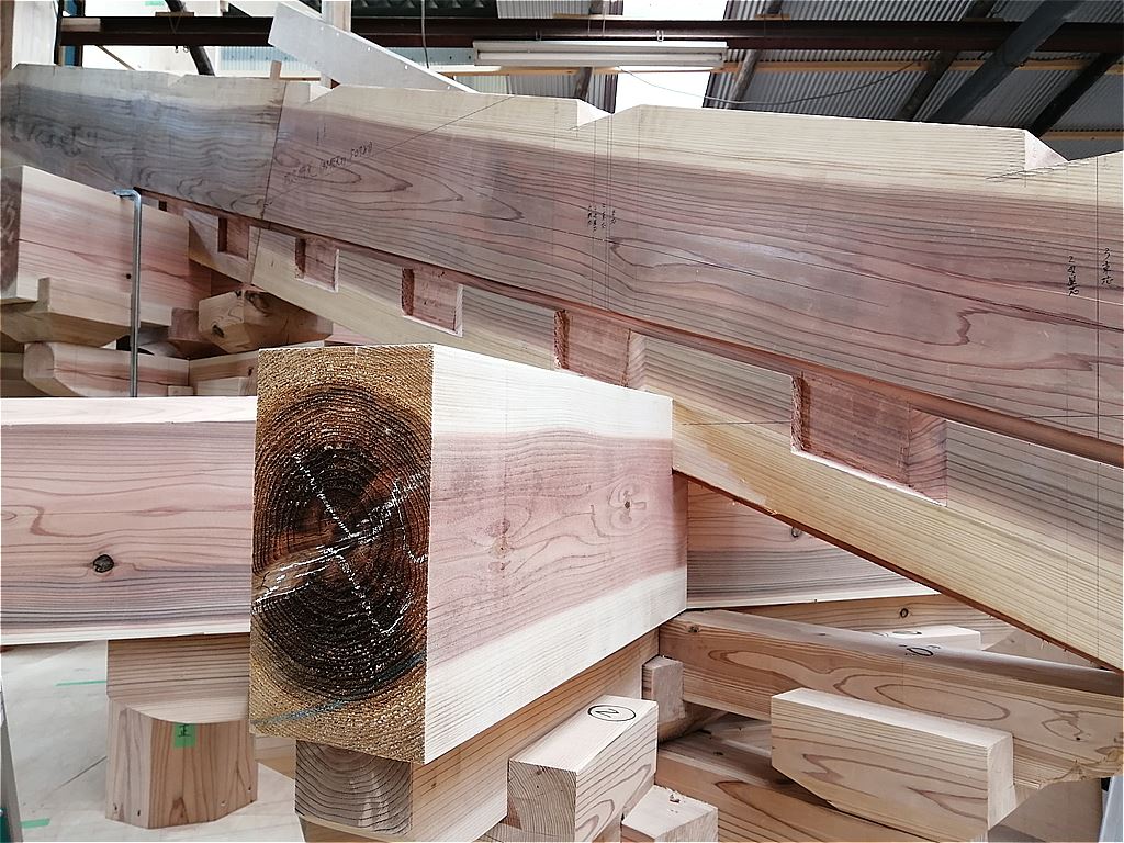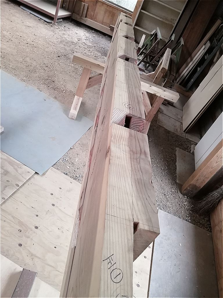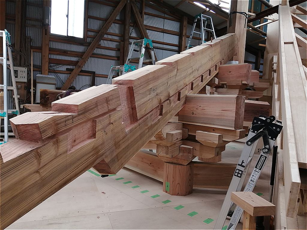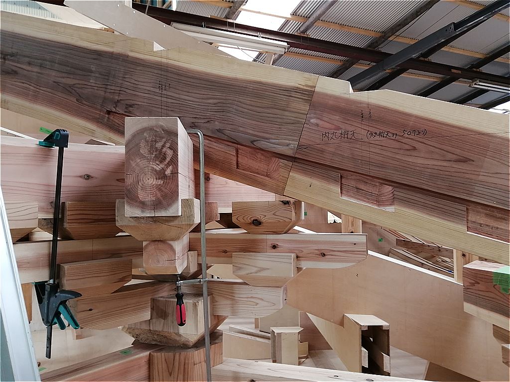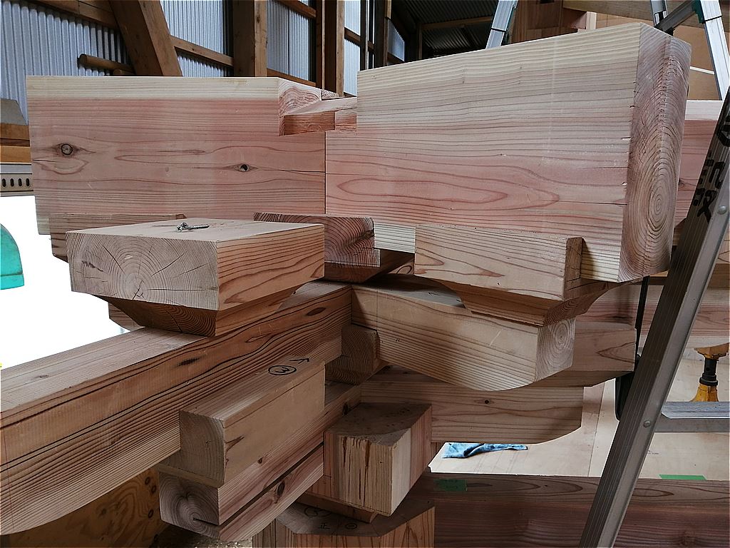 県内でもほとんどできるところが無いとされる八角堂の制作作業中です。実例が少ないので試行錯誤しながら作業しています。写真は1回目の仮組確認作業中の様子です。これから材料を変えて精度を上げながらパーツを制作していきます。
