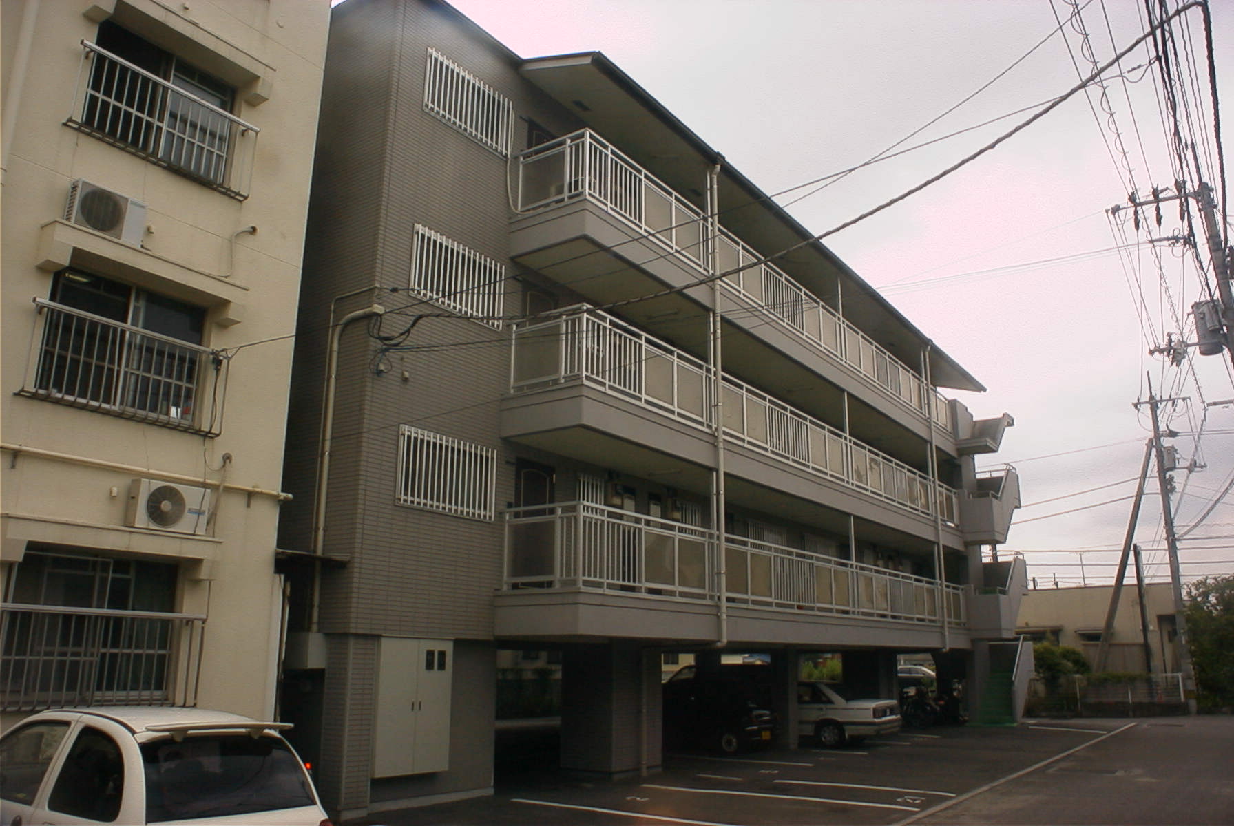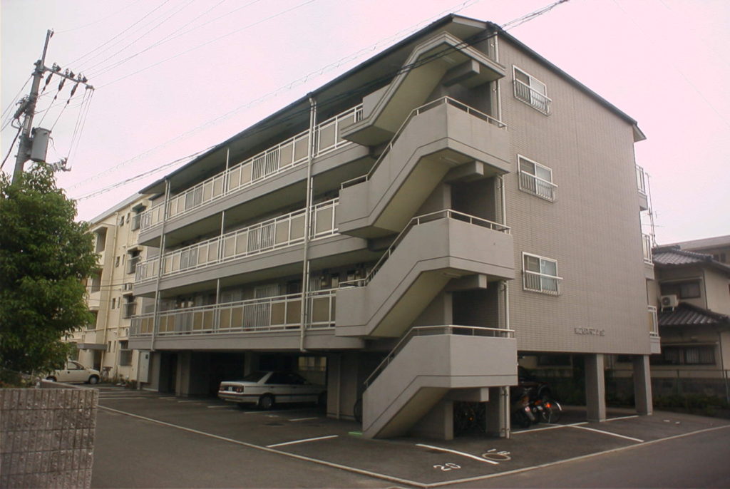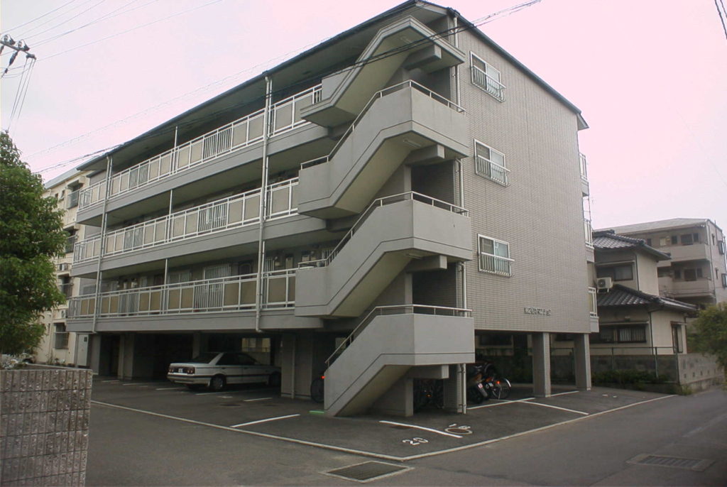 独り身から若い夫婦二人までおしゃれに住むことのできるマンションです。マイカーを使うことの多い現代に対応し、あえて一階部分を駐車スペースと致しました。シックなグレーを基調に階段踊り場部分に白をアクセントにあしらっています。このマンションはシリーズとしてさらに第三松本マンションもあります。