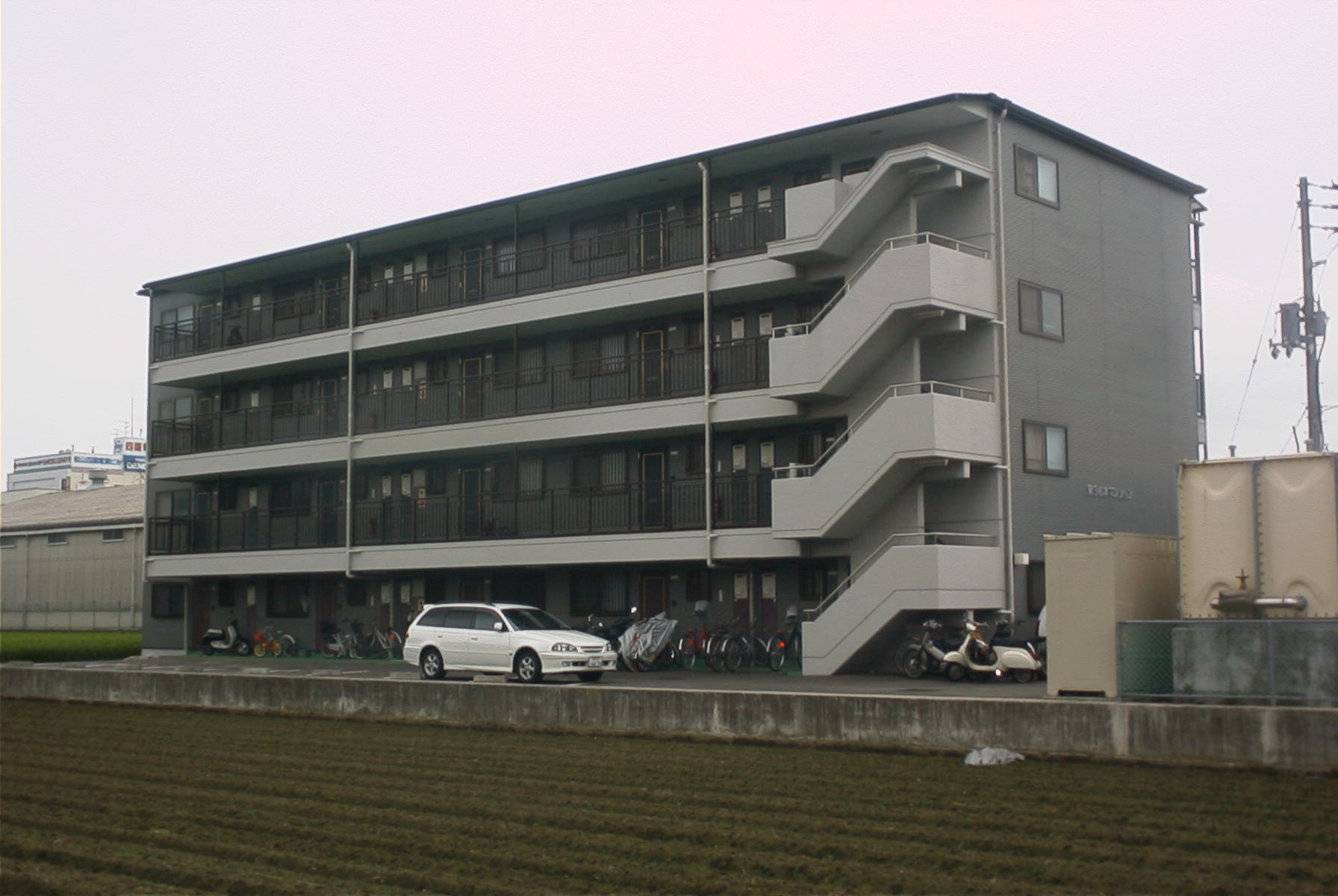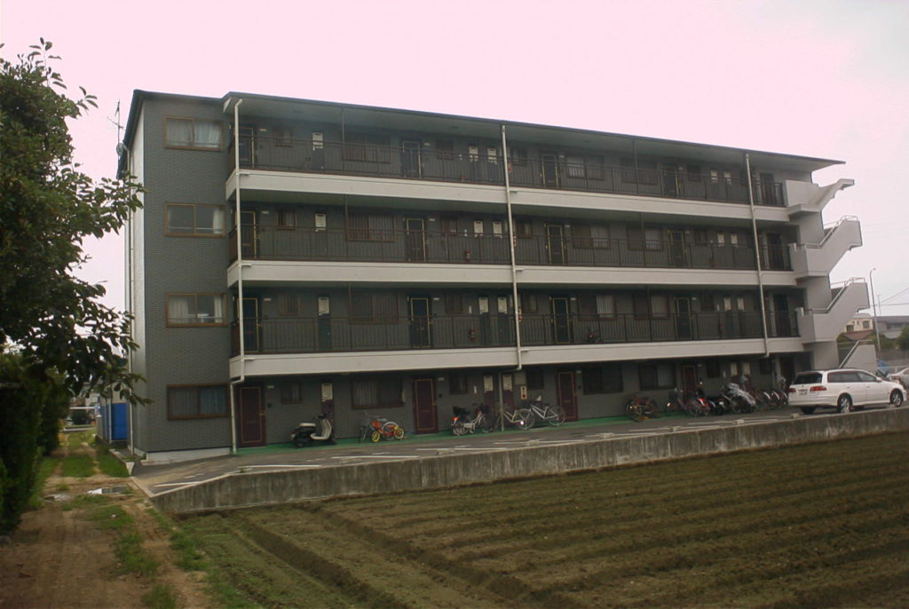 独り身から若い夫婦二人までおしゃれに住むことのできるマンションです。シックなグレーを基調に階段踊り場部分に白をアクセントにあしらっています。このマンションはシリーズとしてさらに第二松本マンションもあります。