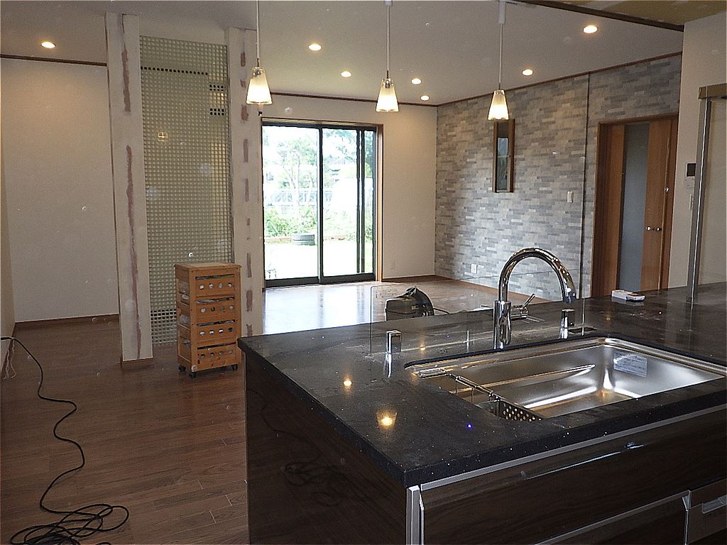 M邸様の改修工事を行いました。リビングキッチンを対面型の広く使い勝手のいいものに変更しました。照明も補助光を採用しハイグレードな空間を実現しました。